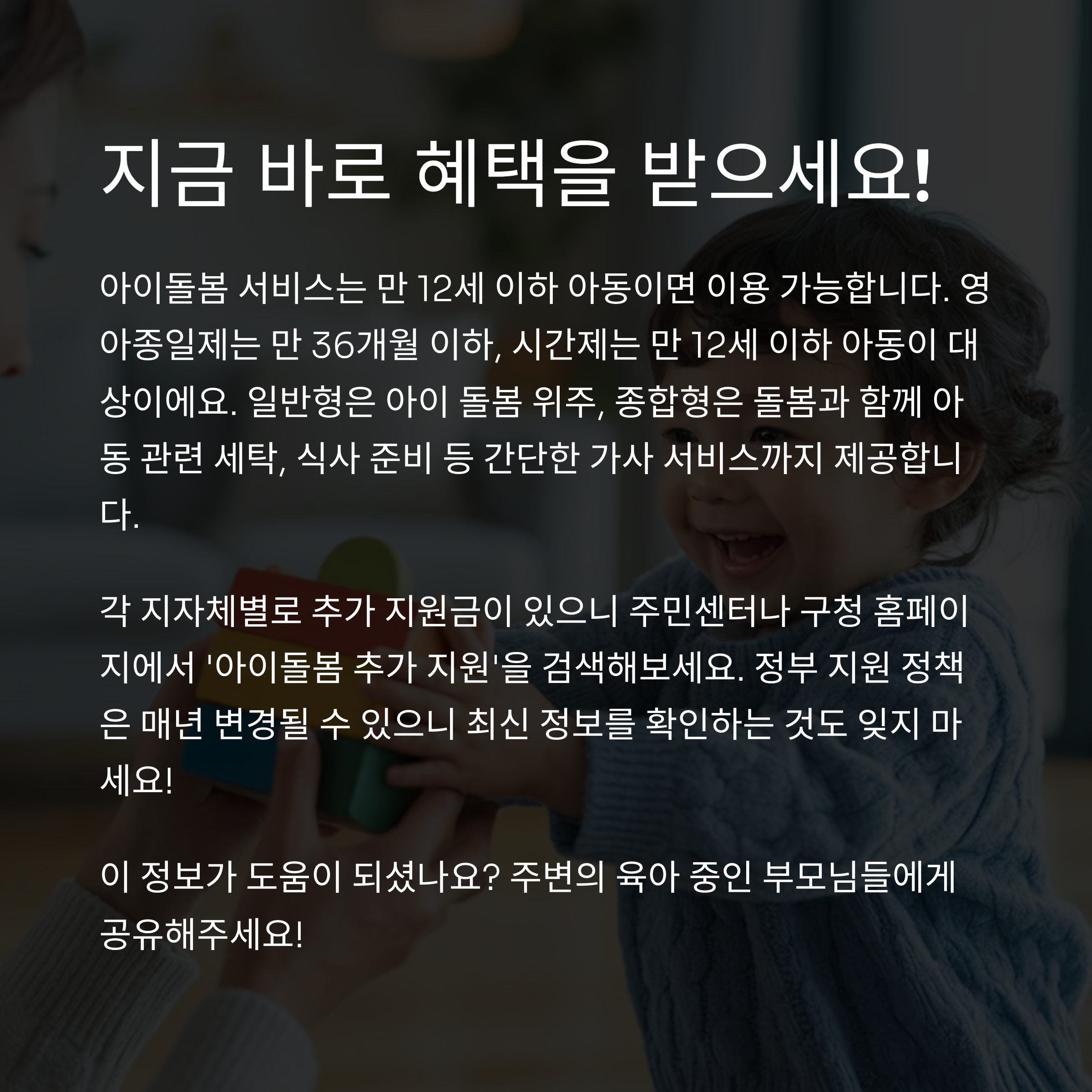 - 지자체 특별 지원 챙기기: 각 지자체별로 추가 지원금이 있어요. 주민센터나 구청 홈페이지에서 '아이돌봄 추가 지원' 검색해보세요.