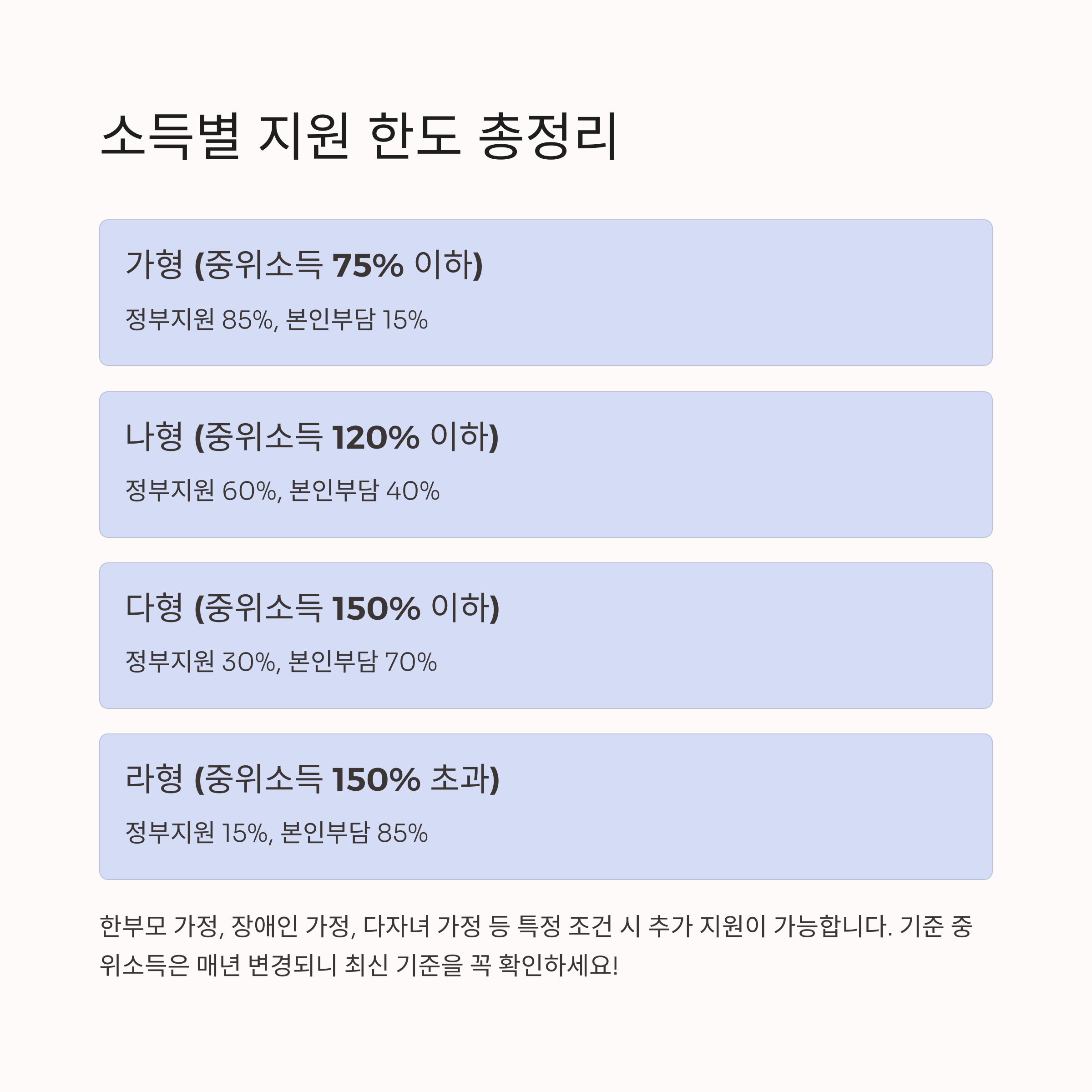 | 가구 유형 | 소득 기준 | 정부지원 비율 | 본인부담 비율 |