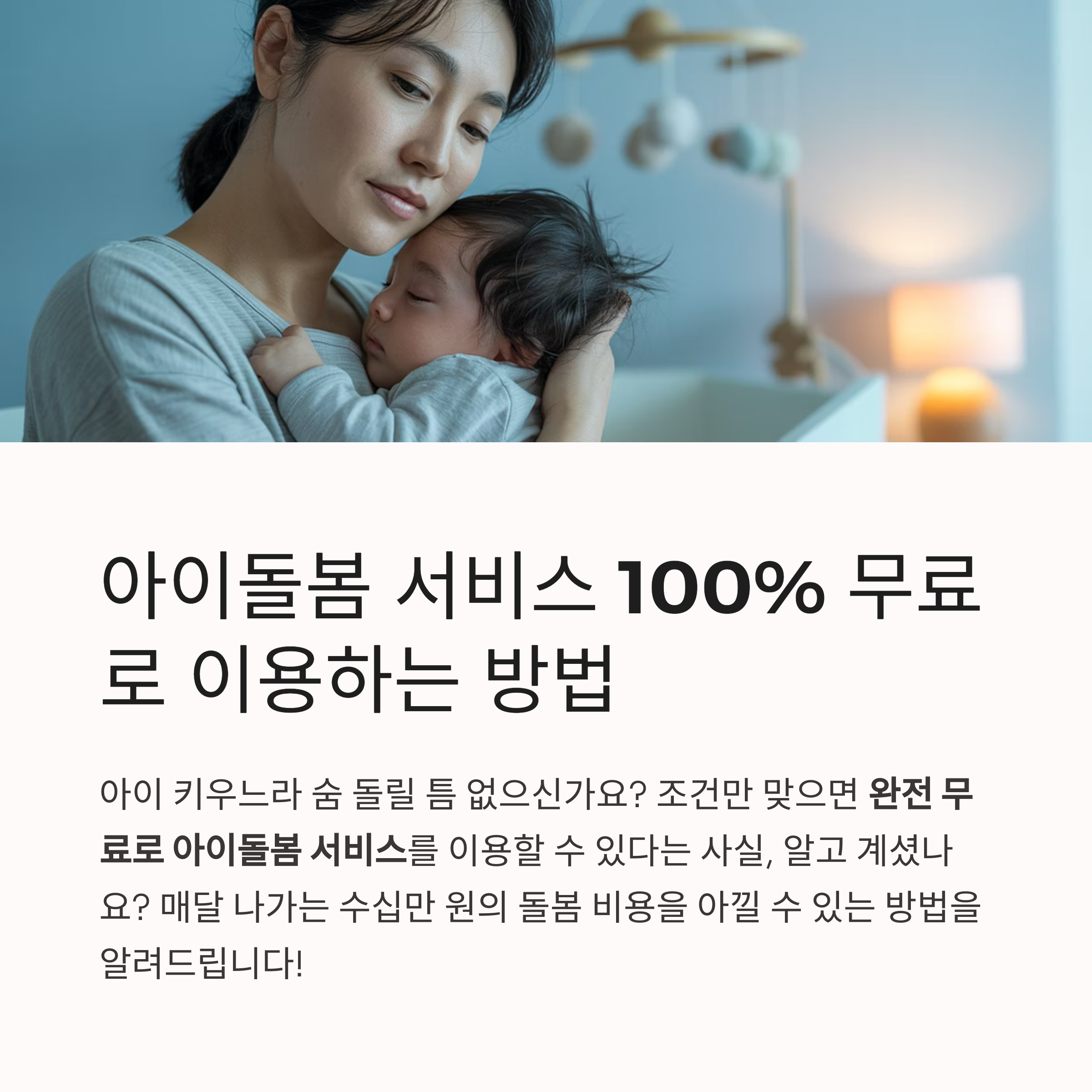 아이 키우는 부모님들, 잠시 숨 돌릴 시간도 없으시죠? 게다가 아이돌봄 서비스 비용 때문에 고민이 깊어지는 분들이 많으실 거예요. 하지만 알고 계셨나요? 조건만 맞으면 완전 무료로 아이돌봄 서비스를 이용할 수 있다는 사실을요! 이번 글에서는 소득 수준별 지원 한도와 무료 이용 방법을 총정리했습니다. 매달 아이돌봄 비용으로 나가는 수십만 원을 아낄 수 있는 방법, 지금 바로 확인해보세요!