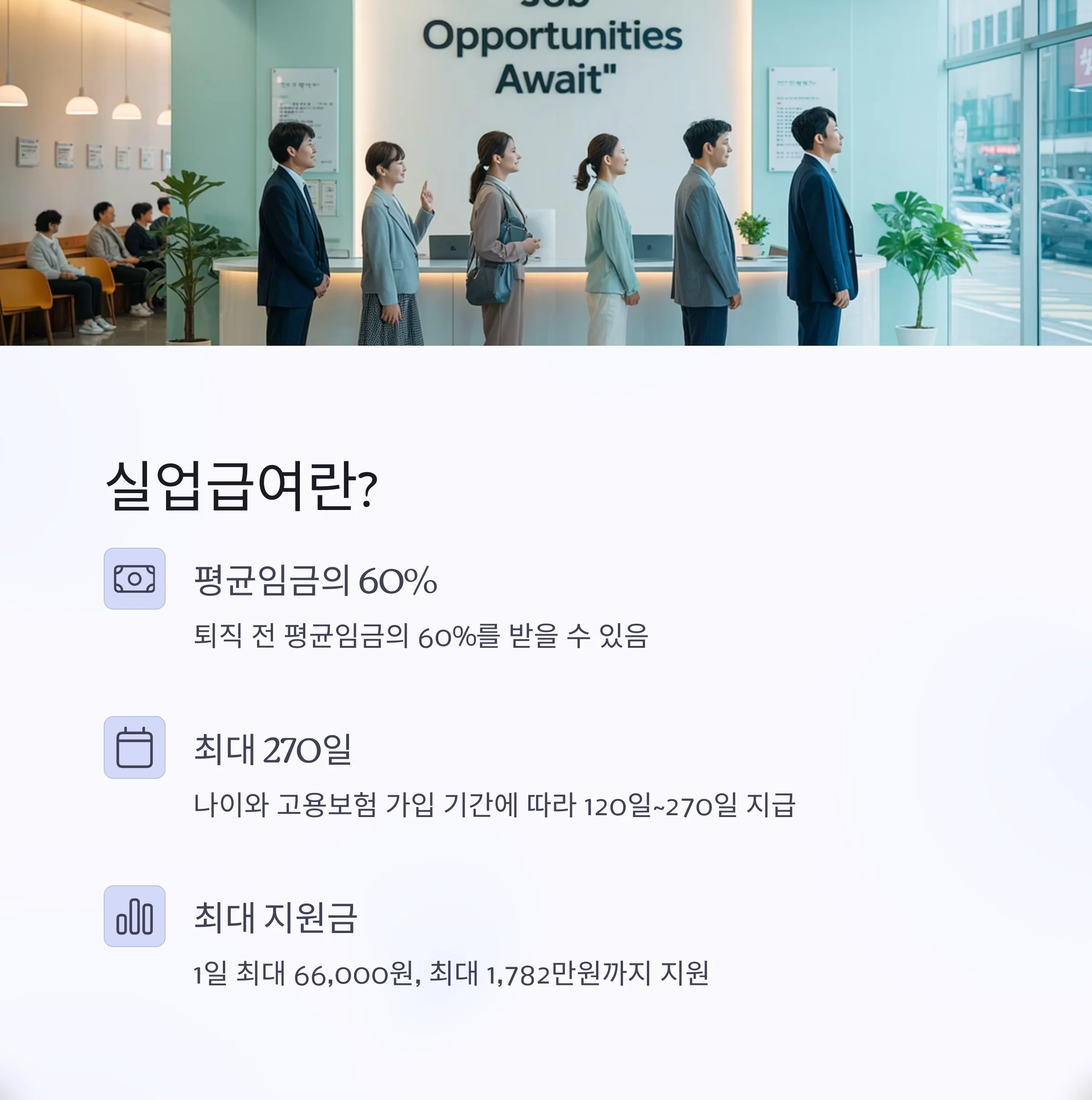 2025년 기준 실업급여는 퇴직 전 평균임금의 60%를 받을 수 있으며, 1일 최대 상한액은 66,000원입니다. 나이와 고용보험 가입 기간에 따라 120일부터 270일까지 지급 받을 수 있어, 최대 1,782만원까지 지원받을 수 있는 중요한 사회 안전망입니다.
