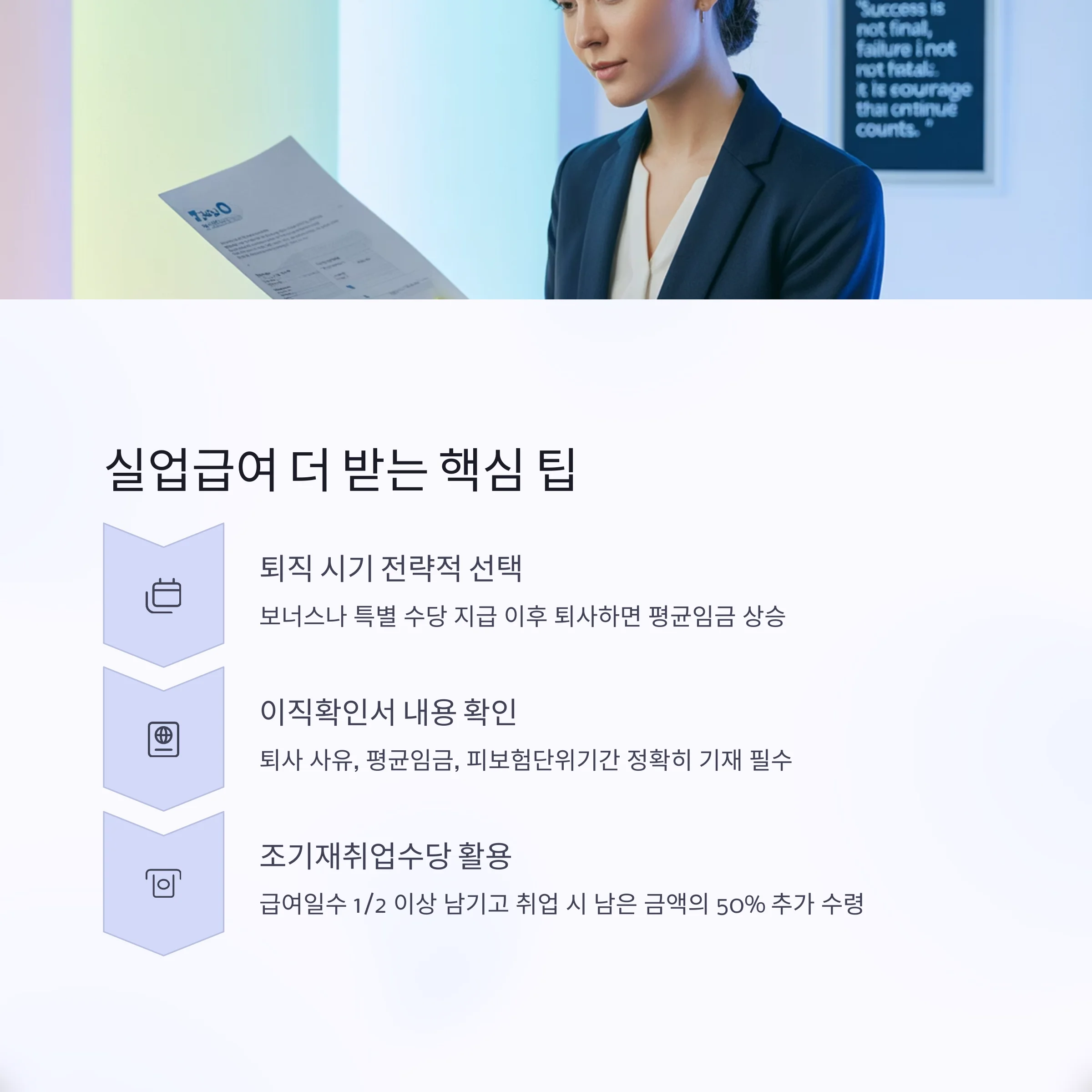 실업급여를 더 받는 가장 효과적인 방법은 조기재취업수당을 활용하는 것입니다. 다음 조건을 충족하면 남은 실업급여의 50%를 추가로 받을 수 있습니다: