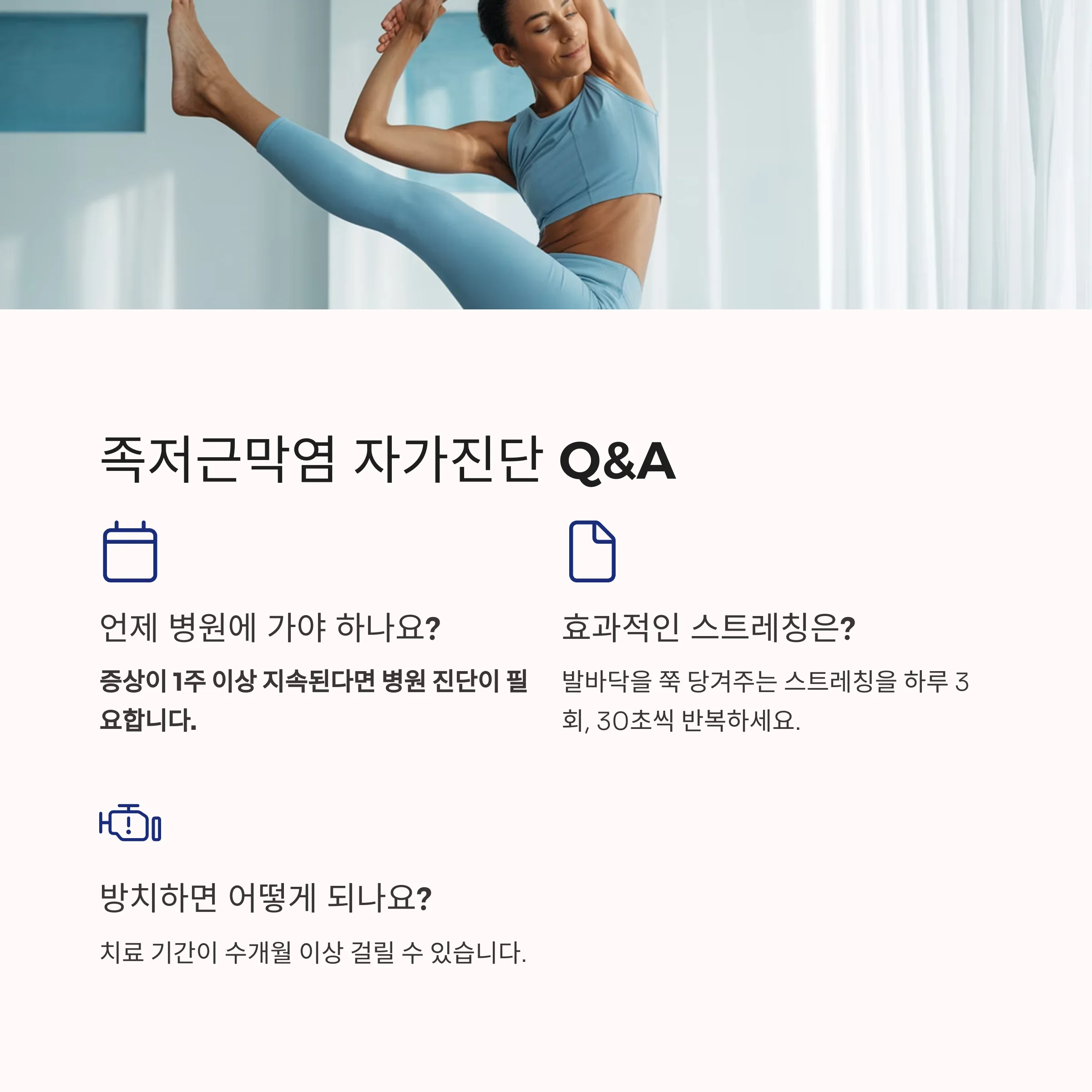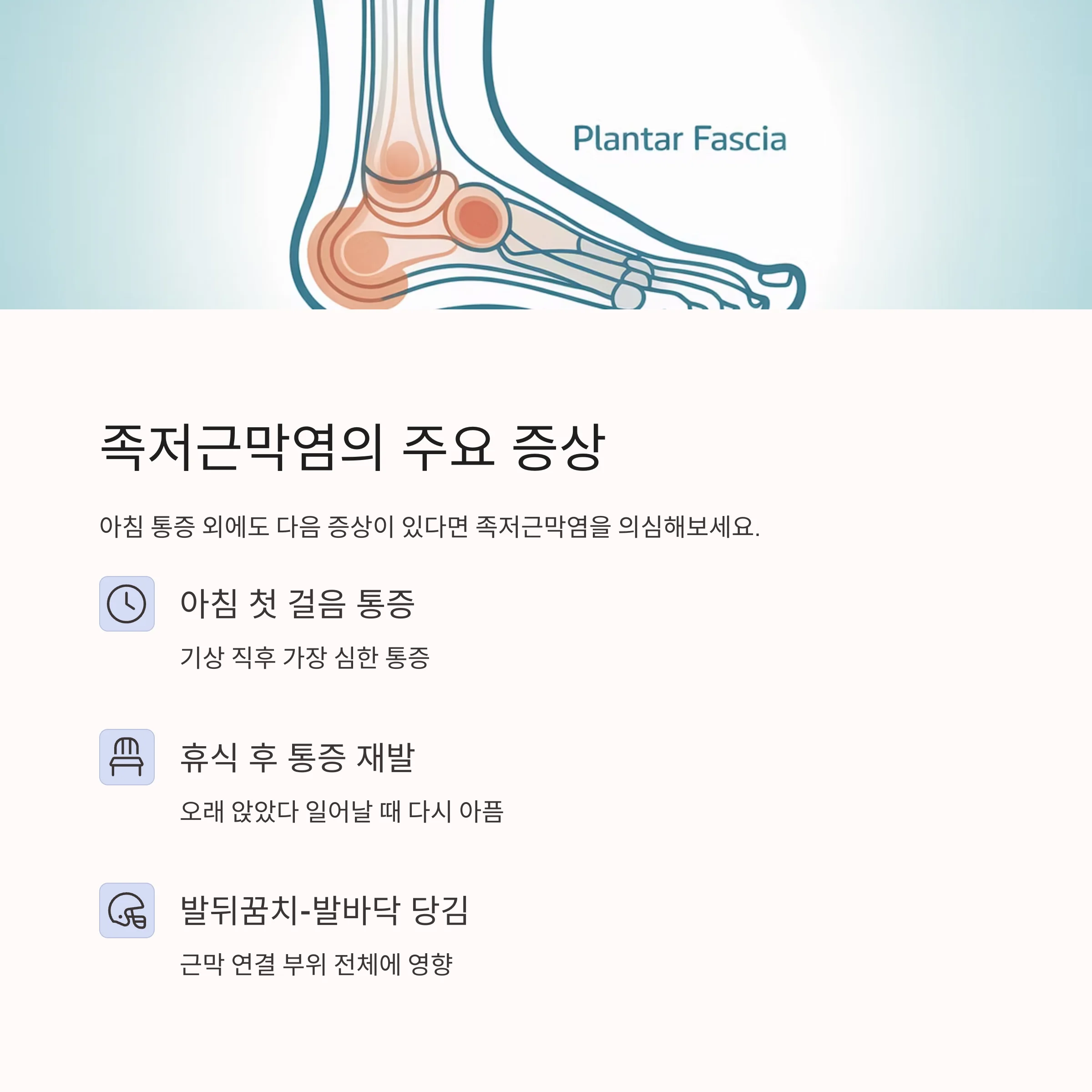 이러한 증상이 반복된다면 단순한 피로가 아니라 족저근막염의 초기 징후일 수 있습니다.