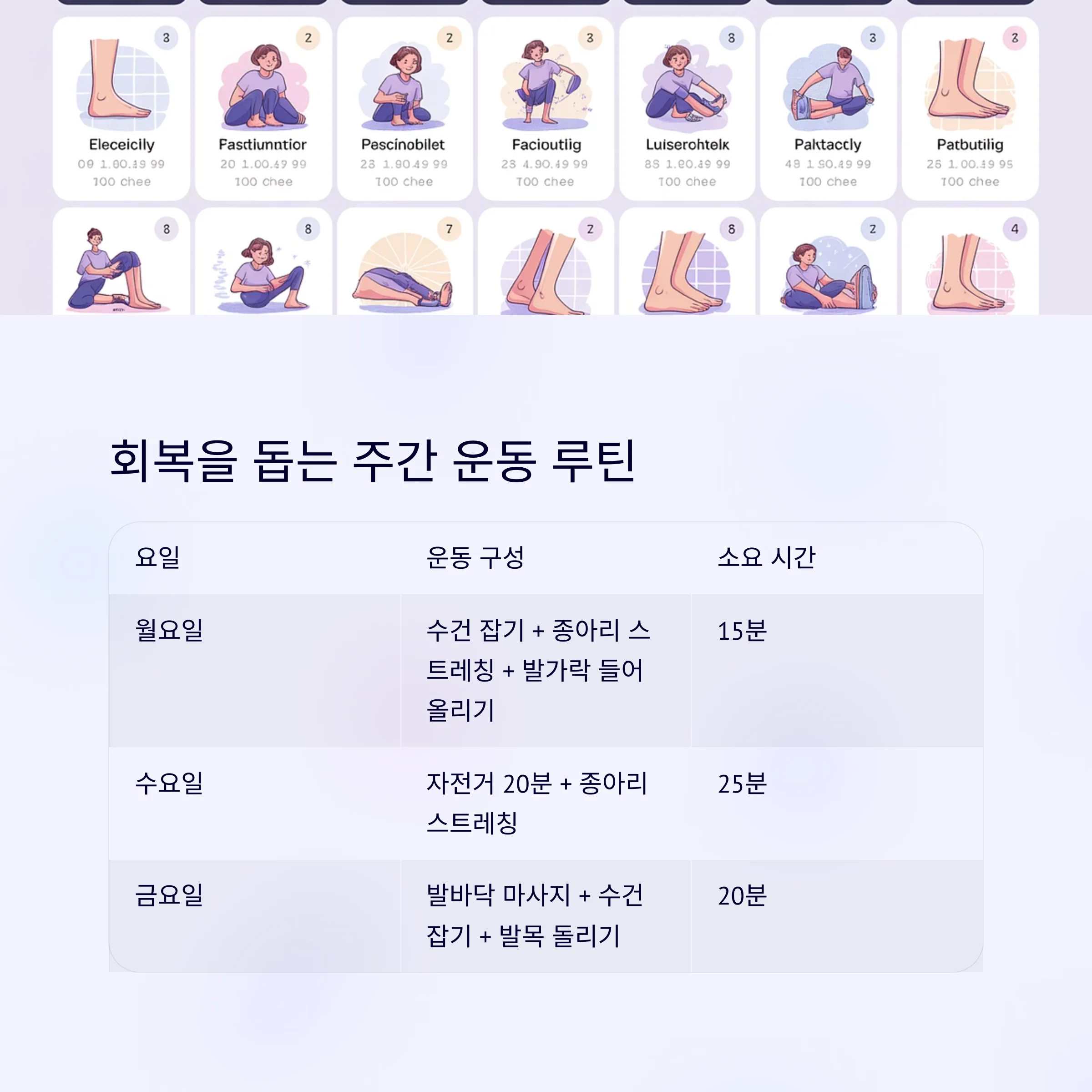 | 월요일 | 수건 잡기 + 종아리 스트레칭 + 발가락 들어올리기 | 15분 |