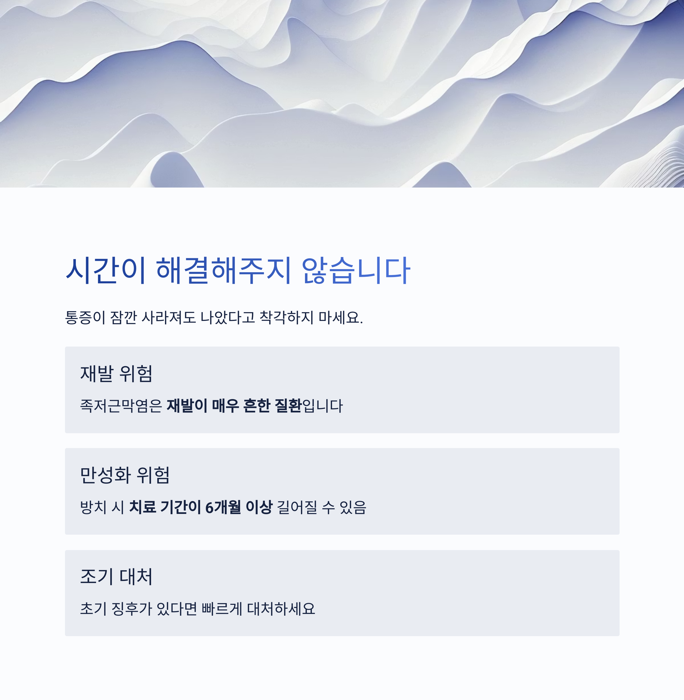 초기에는 가벼운 통증으로 시작되지만, 제때 대처하지 않으면 만성화되어 일상생활에 큰 불편을 초래할 수 있습니다.