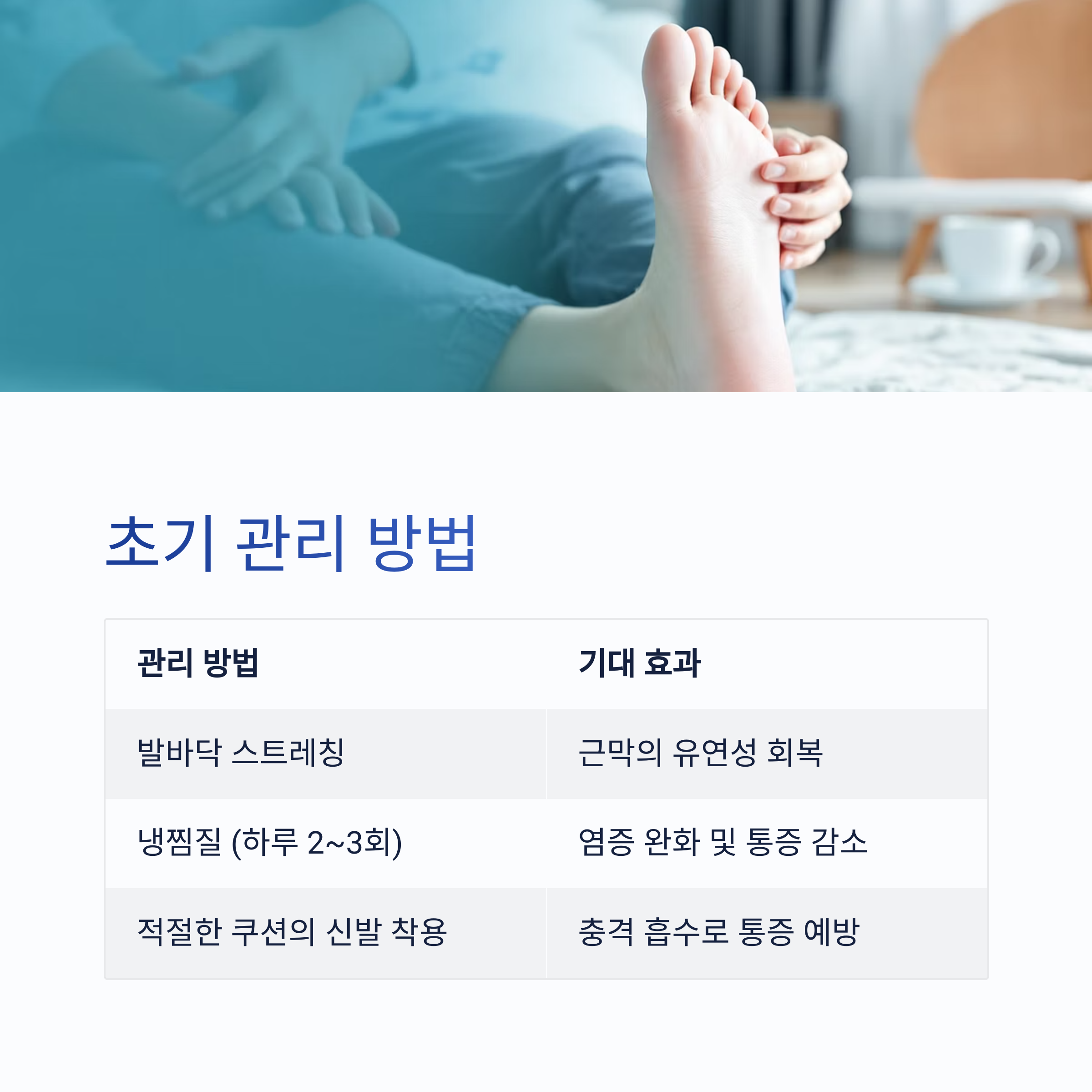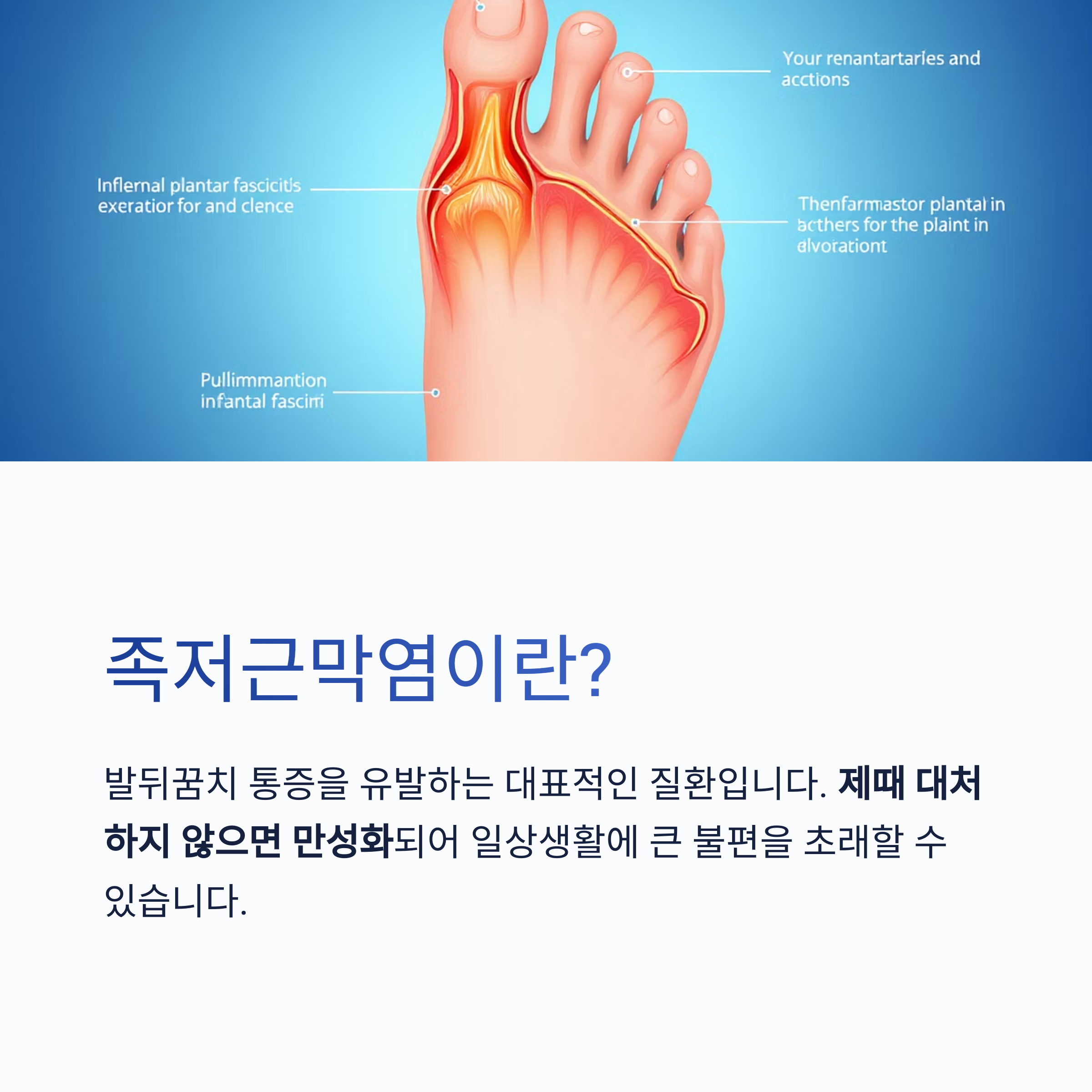 그 결과 만성 족저근막염으로 발전할 수 있으며, 보행 패턴 변화, 무릎·허리 통증으로 이어질 수도 있습니다.