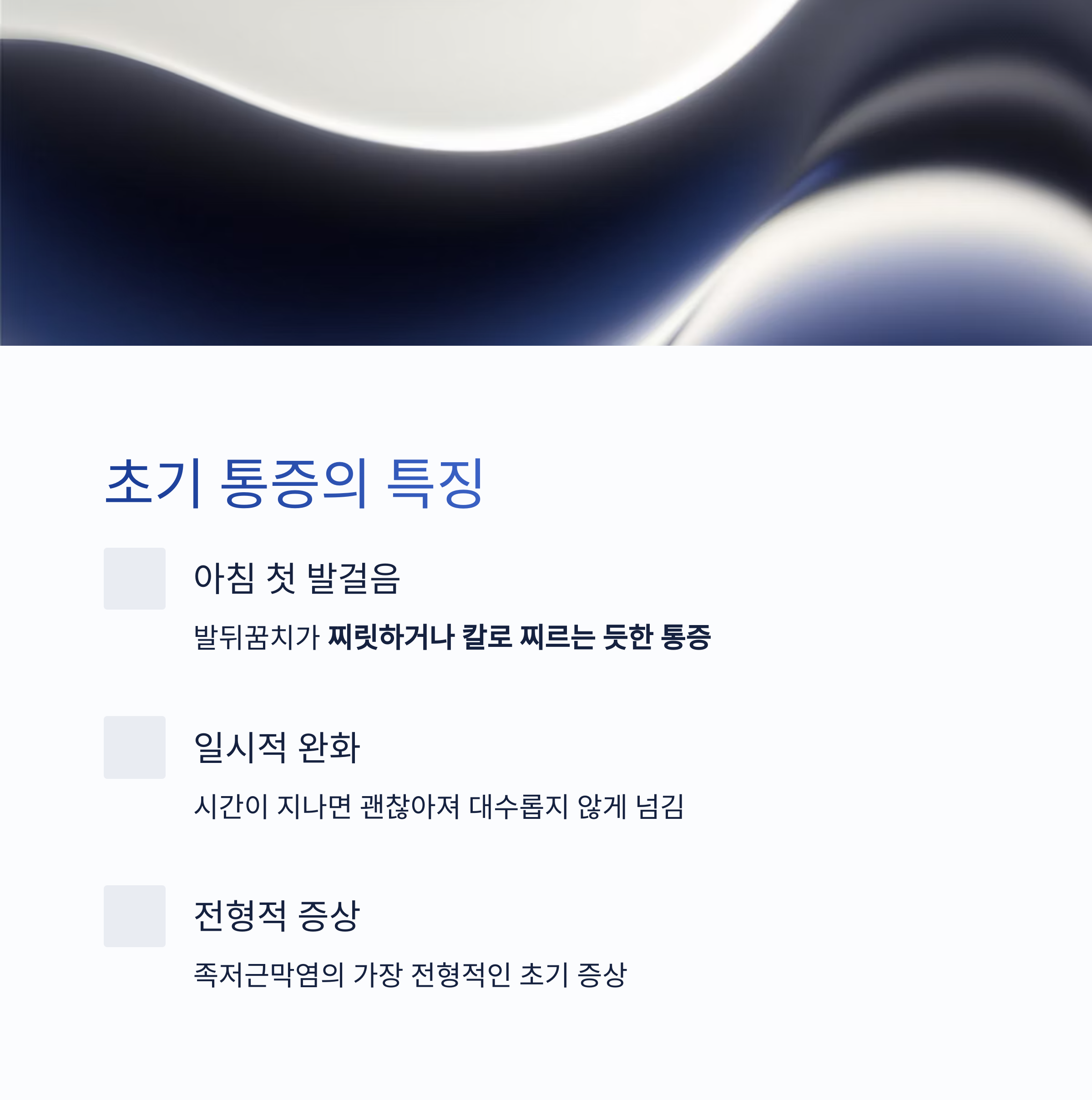 특히 아침에 첫 발을 디딜 때 발뒤꿈치가 찌릿하거나 칼로 찌르는 듯한 통증이 느껴지는 경우가 많습니다.