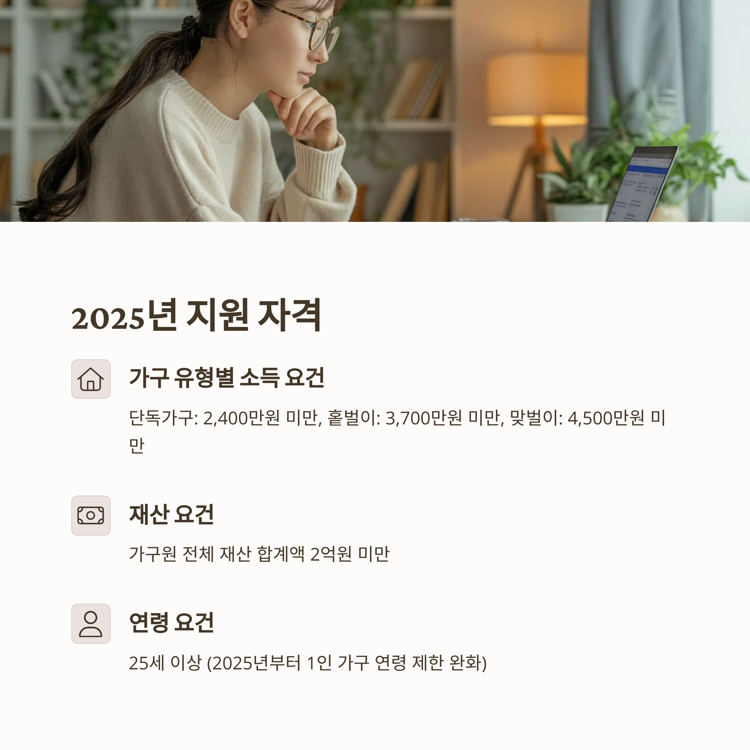 - 1인 가구 확대: 2025년부터 1인 가구 연령 제한 완화 (25세 이상부터 신청 가능)