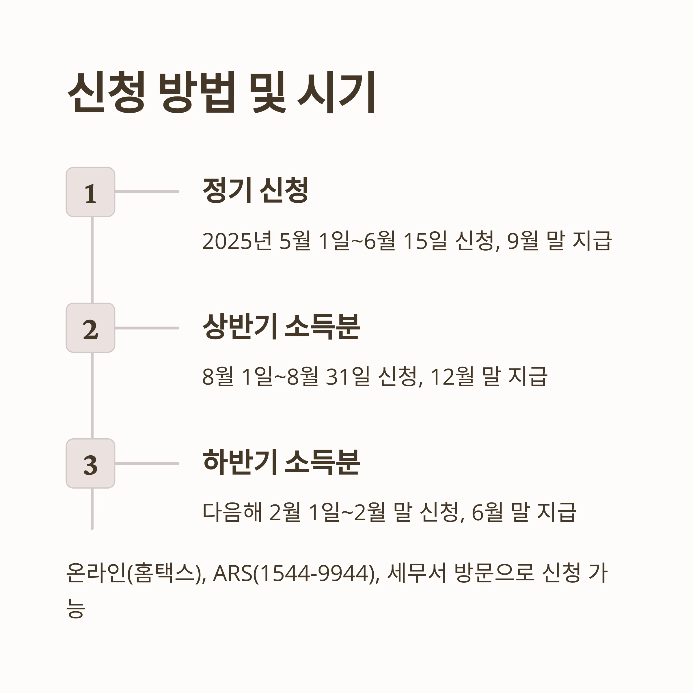 - 상반기 소득분: 8월 1일 ~ 8월 31일 신청, 12월 말 지급