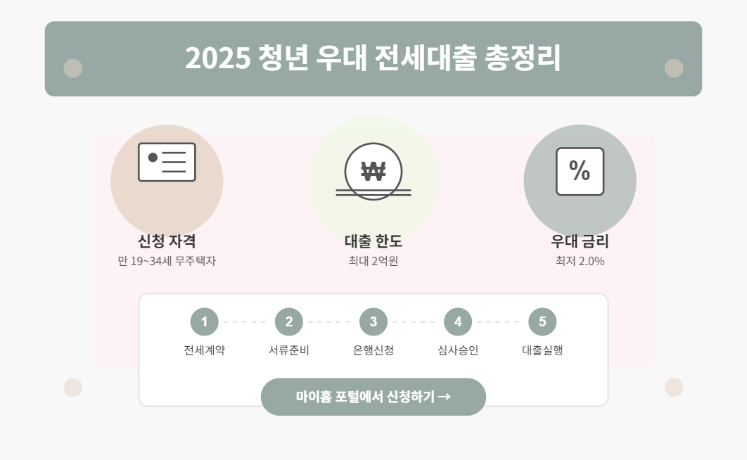 2025년 청년 우대 전세대출은 청년층의 주거 부담을 크게 줄여줄 수 있는 좋은 기회입니다. 최대 2억 원까지의 대출 한도와 최저 2.0%의 저금리는 주거비 부담에 시달리는 청년들에게 큰 도움이 될 것입니다. 자신의 조건에 맞는 지원 혜택을 꼼꼼히 살펴보고, 주거 안정을 위한 첫걸음을 내딛어보세요!